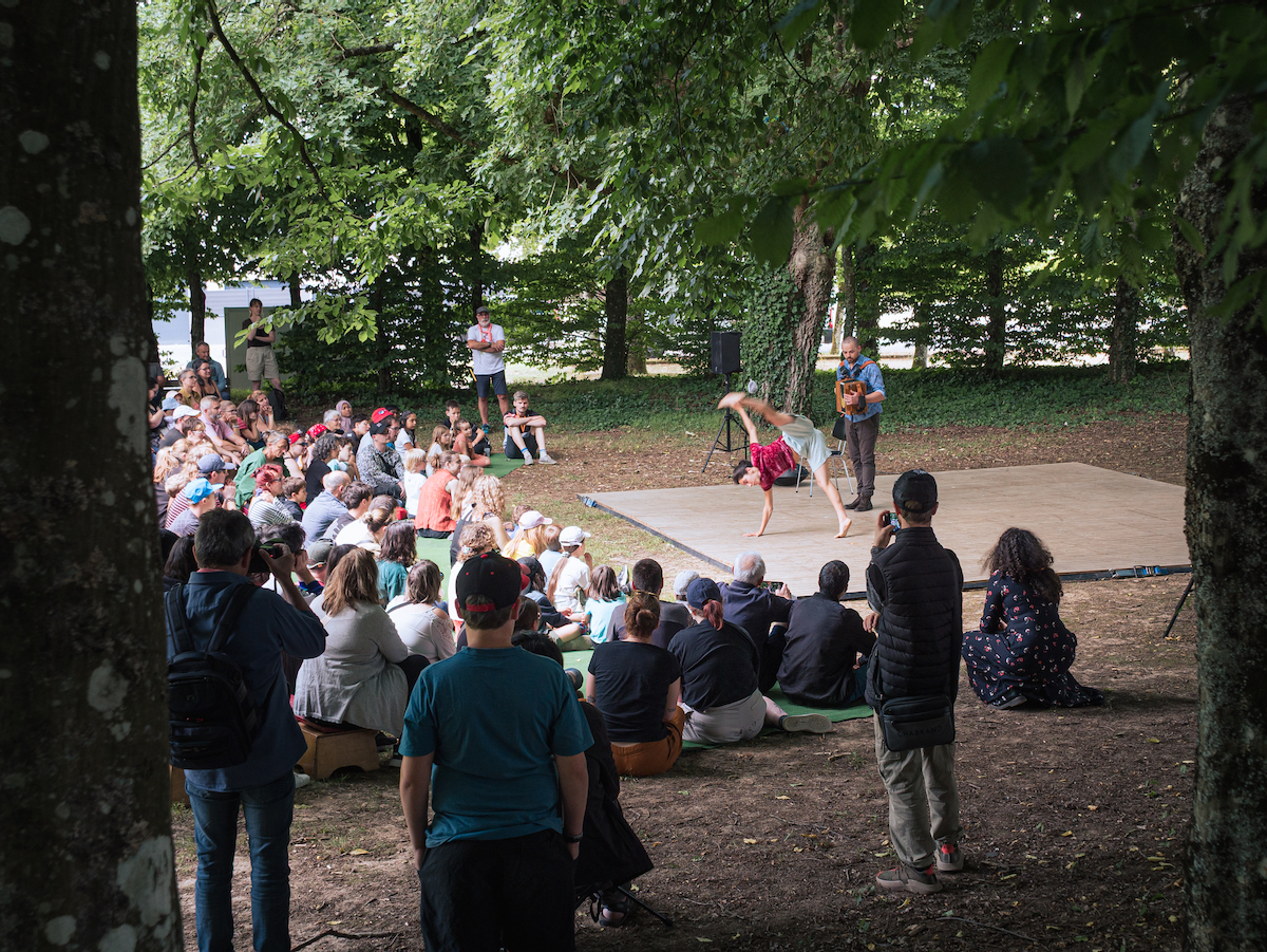 La compagnie la Barque a proposé à deux reprises sont spectacle « Tarmac » dans un joli écrin de verdure à l’extrémité du site du festival. Une danseuse, un accordéon, une improvisation entre humour et poésie, et un moment de douceur dans une ombre bienvenue.