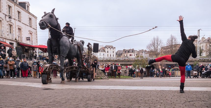 Un lourd cheval mécanique dont chaque pas faisait résonner le pavé de la Grande Rue, tour à tour provoqué, menacé ou cajolé par une danseuse légère et versatile qui lui tournait autour telle la mouche du coche. C’est cet étrange spectacle qu’a offert la Compagnie Paris-Bénarès aux Redonnais dans le cadre des animations de Noël, dimanche 19 décembre.
